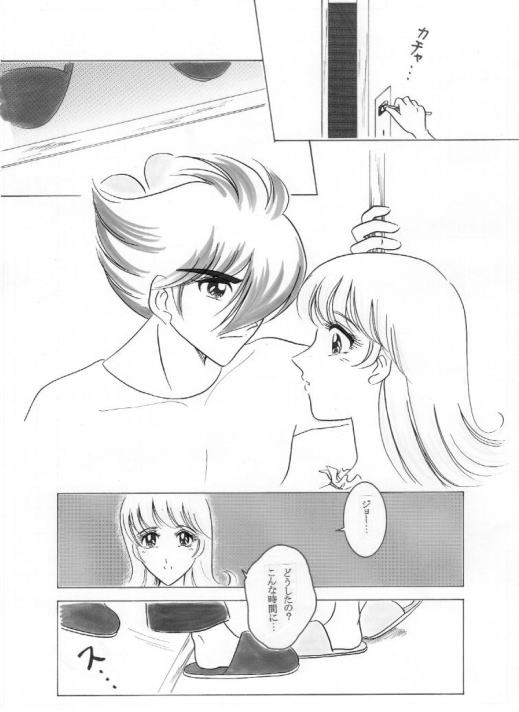 ジョーの耳元でそっと囁いた。ジョーの体が更に熱くなる。再度交わされる唇と舌の狂乱。ジョーは、手のひらで柔らかいふくらみを、揉み上げる。その頂点に、恥ずかし気にピンク色をして震えている、かわいらしい乳房を指で摘まむ。